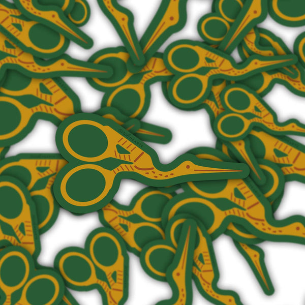 Transform ordinary items into unique pieces with our Stork Scissors Sticker. Featuring a classic stork design with a deep green background and a vibrant golden yellow scissors, this contour cut sticker is perfect for personalizing your phone, laptop, sewing machine, or water bottle. Add a touch of charm to your belongings and stand out from the crowd.